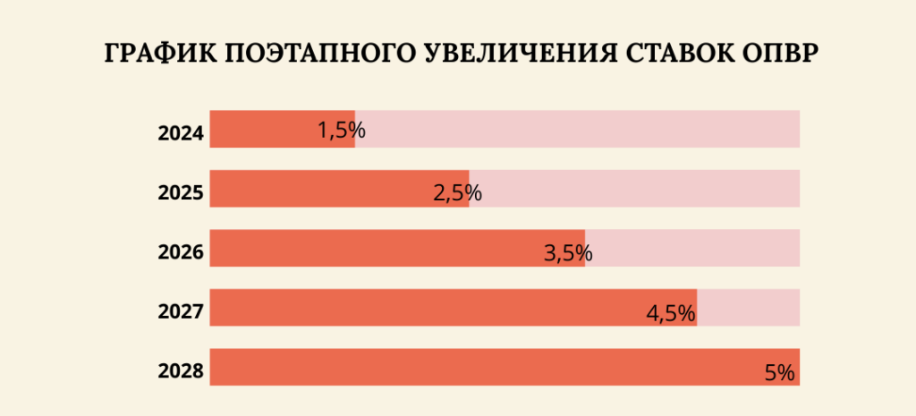 Размер ставки ОПВР определяется как процент от дохода работника: 1,5% с 2024 года, 2,5% с 2025 года, 3,5% с 2026 года, 4,5% с 2027 года и 5% с 2028 года.