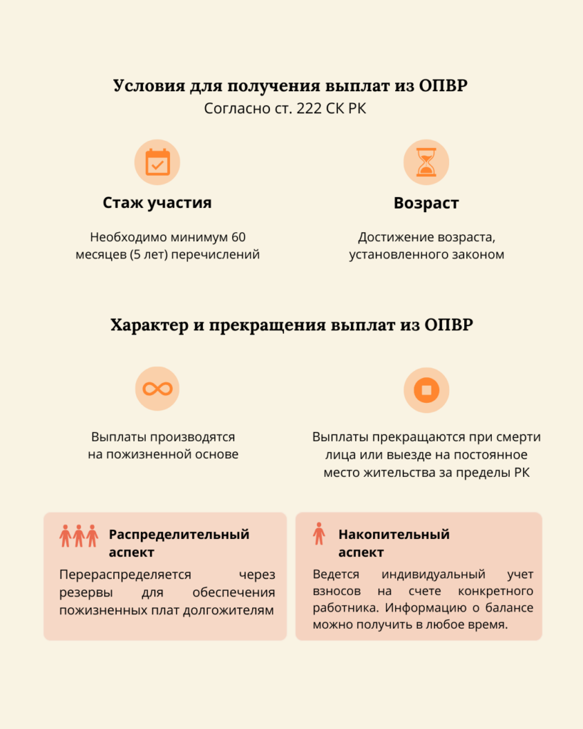 ОПВР – это гибрид накопительно-распределительной модели: с одной стороны, есть учет на счете конкретного работника. Работник может получать информацию о состоянии условного пенсионного счета и о сумме, накопленной за счет ОПВР (пп. 4 п. 1 ст. 40 СК РК). С другой стороны, юридически средства принадлежат системе, не наследуются и могут перераспределяться через резервные фонды, если условия не выполняются.