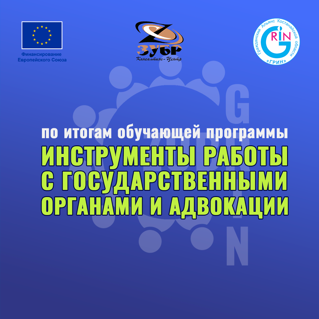 С мая 2024 года Консалтинг-Центр «ЗУБР» (г. Усть-Каменогорск) реализует трехлетний проект в партнерстве с ОФ «Гражданский альянс Костанайской области «ГрИн» при финансовой поддержке Европейского Союза. Проект направлен на усиление влияния организаций гражданского общества посредством участия в оценке государственных программ и проектов в Республике Казахстан.